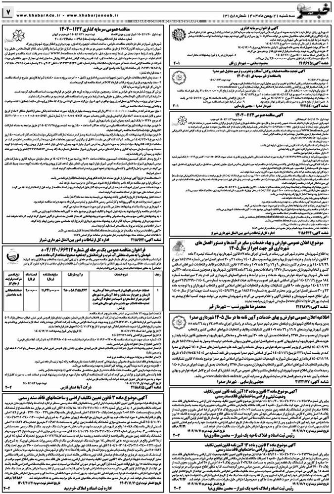 بدین وسیله به اطلاع شهروندان و ذینفعان محترم شهر صدرا می رساند در راستای اجرای ماده 57 ، 74و بند 26 ماده 55 قانون شهرداریها و بندهای 9 ، 16 و 26 ماده 107 قانون تشکیلات ، وظایف و انتخابات شوراهای اسلامی کشور و انتخاب شهرداران مصوب سال 1375 و اصلاحات بعدی آن ، ماده 30 آیین نامه مالی و معاملاتی شهرداریها و همچنین قانون درآمد پایدار و هزینه های شهرداریها و دهیاریهای کشور و دستورالعمل اجرایی عناوین و بهای خدمات و ترتیبات وصول به شماره 184125 تاریخ 29/09/1404 ابلاغی از وزیر کشور ، تعرفه عوارض و بهای خدمات و آیین نامه ها و دستورالعمل های سال 1405 شهرداری صدرا که در جلسه شماره 336 تاریخ 6/11/1404 شورای اسلامی شهر صدرا تصویب و طی نامه شماره ص 1404/7544/5641 تاریخ 19/11/1404 فرمانداری شهرستان شیراز به تایید هیات تطبیق مصوبات شورای اسلامی شهر صدرا موضوع ماده 118 قانون تشکیلات ، وظایف و انتخابات شوراهای اسلامی کشور و انتخاب شهرداران مصوب سال 1375 و اصلاحات بعدی آن جهت اجرای در سال 1405 رسیده است ، برای اطلاع عموم شهروندان و ذینفعان منتشر و اعلان عمومی می گردد .شایان ذکر است شرح کامل تعرفه عوارض و بهای خدمات و آیین نامه ها و دستورالعمل ها در سایت شهرداری صدرا به آدرس www.shahrdari-sadra.ir می باشد . فایل اطلاعیه اعلان عمومی عوارض و بهای خدمات و آیین نامه ها در سال 1405 شهرداری صدرا فایل تعرفه سال 1405
